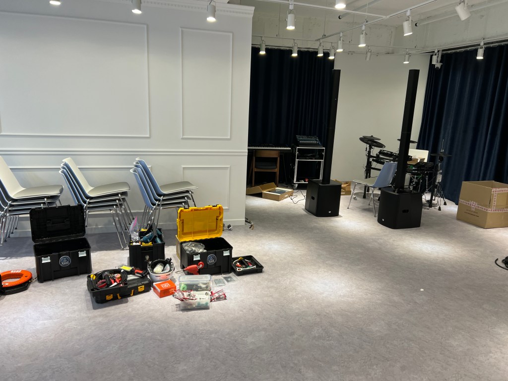 적당한 출력의 컬럼 어레이로 좀 더 저렴하게 할 수도 있지만, 밴드 연습실 대여를 하기 때문에 조금더 해상도와 출력이 좋은 컬럼 어레이 스피커를 추천하여 시공을 했습니다.