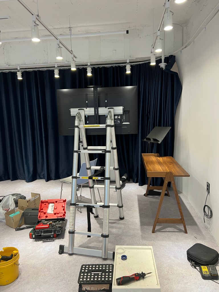 시공 전 상담을 통해 교회도 그런 부분에 인지하고, 촬영 스튜디오에 배경을 위해서 두꺼운 벨벳 커튼을 뒤로 설치를 했습니다.