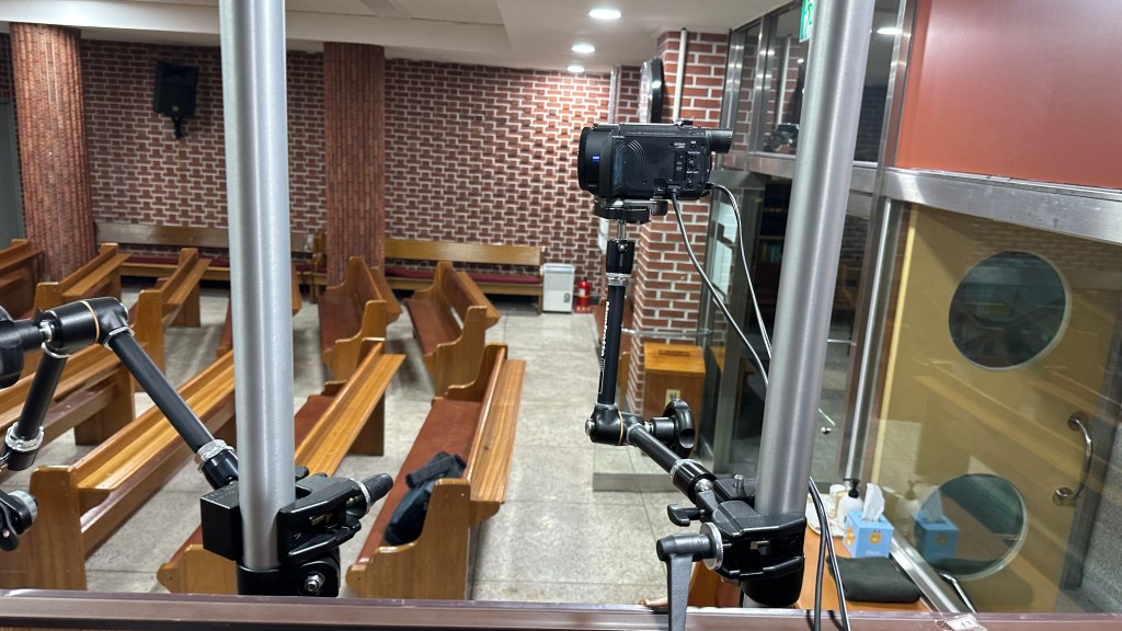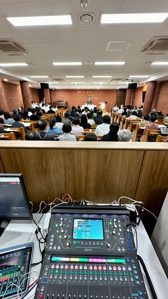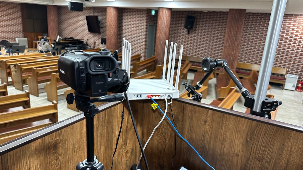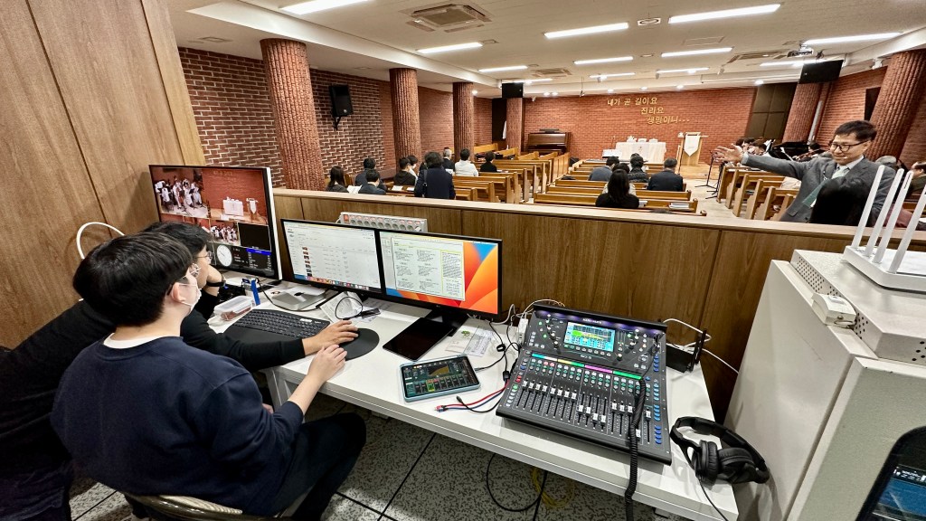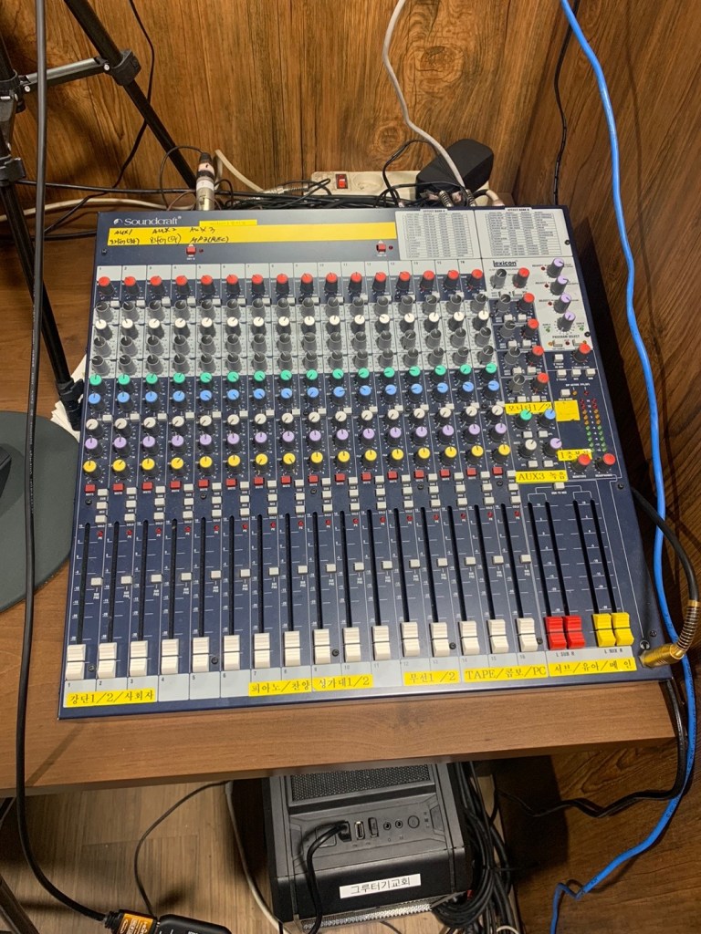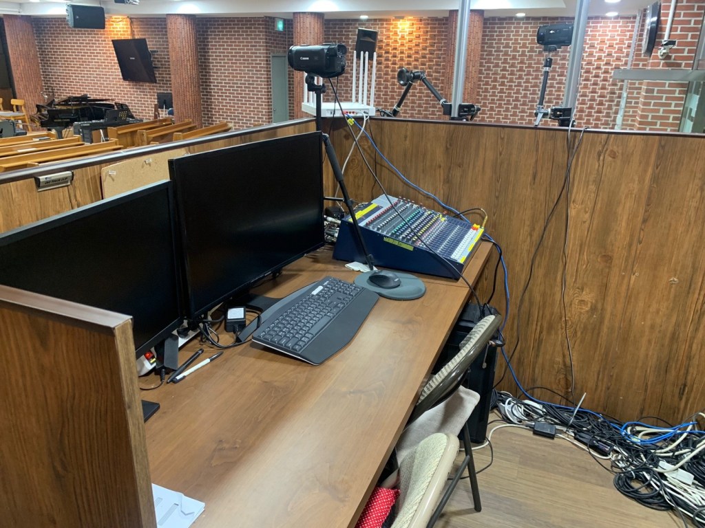 성가대와 챔버의 마이킹은 예배당 내 확성용이 아닌(확성을 하게 되면 하울링이 심하게 생김. 공간이 작아 굳이 스피커로 확성이 필요하지 않음.) 녹음과 중계용입니다.