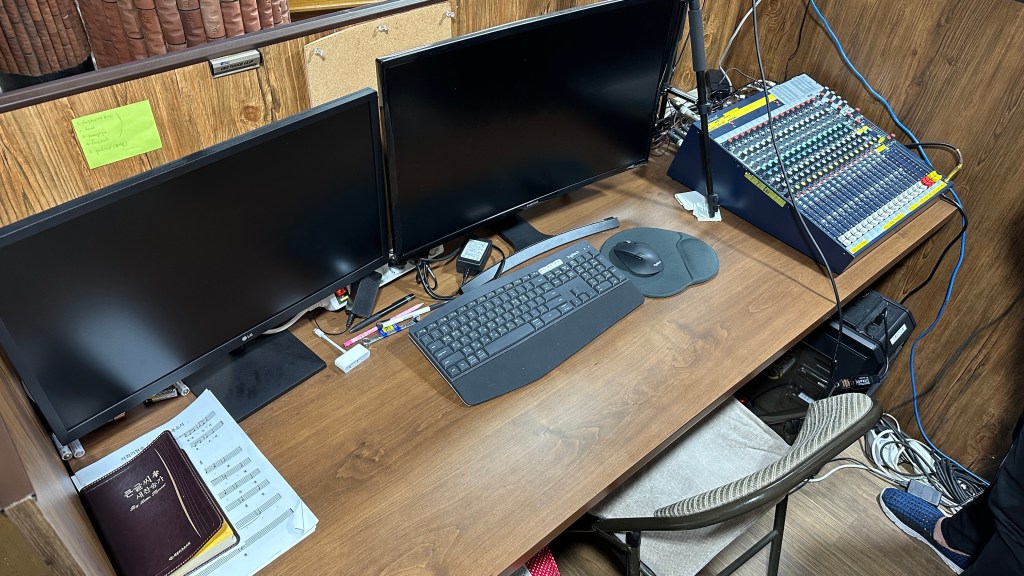 담임 목사님께서는 아이패드로 말씀 강해를 준비 중이신데, 방송실의 중계 컴퓨터를 Mac Mini로 하기에 에어 플레이로 무선으로 간편하게 연결해 예배 영상으로 송출하도록 하였습니다.