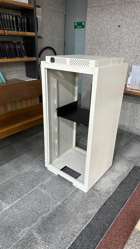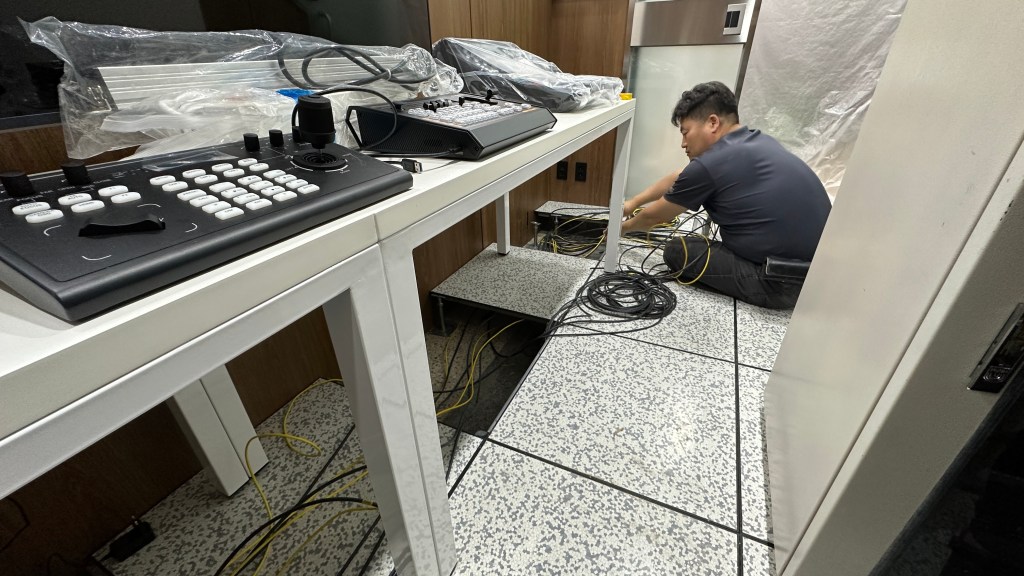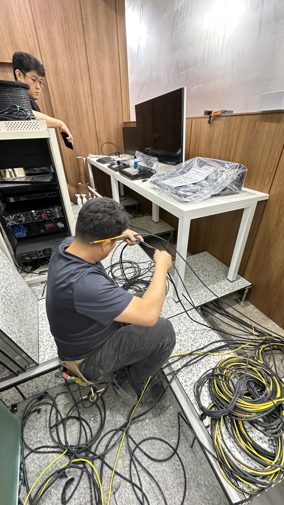 방송실은 케이블 작업과 유지 보수에 좋은 엑세스 플로어를 바닥으로 만들어져서 음향 랙과 영상 장비 쪽으로 케이블이 나오게 하는 작업이 수월했습니다.