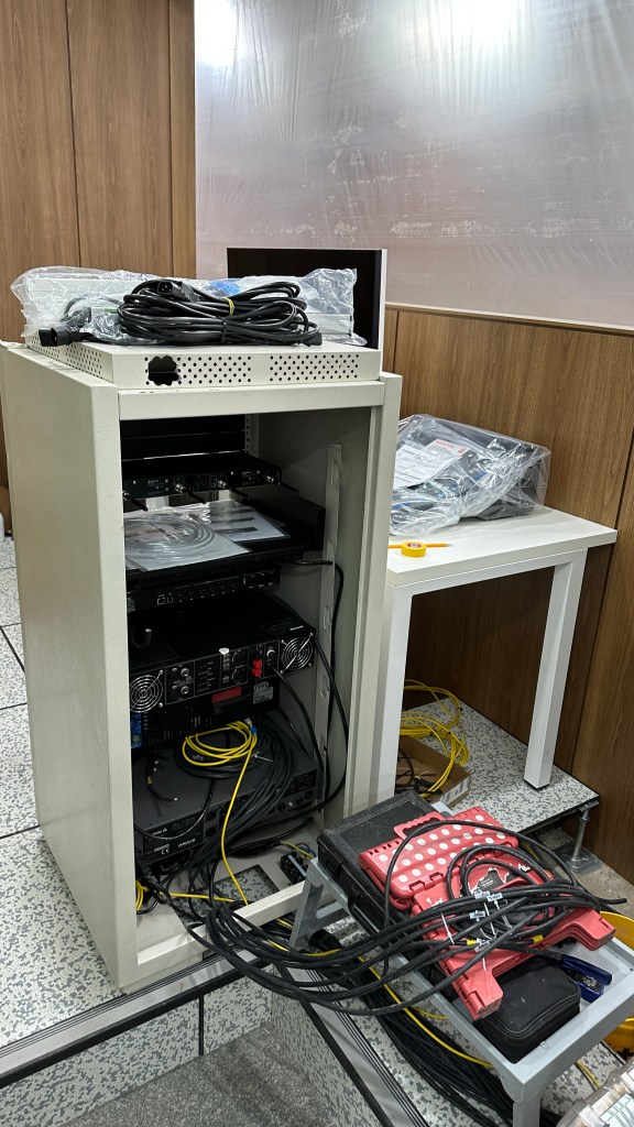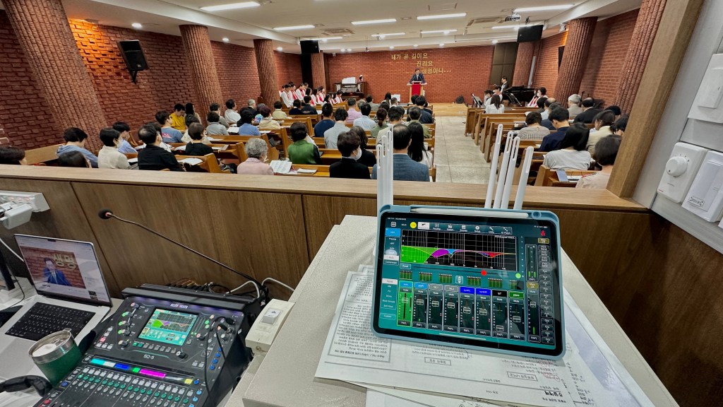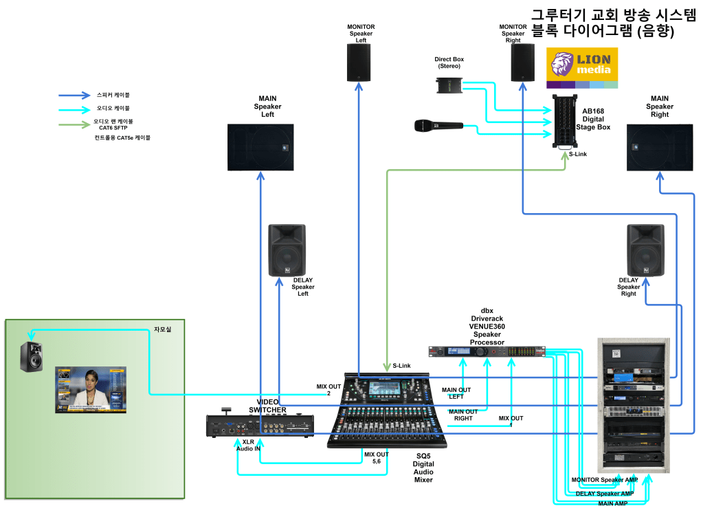 이번 시공은 흡음 시공과 컬럼 어레이 스피커가 시공되지 않고 기존 포인트 소스 스피커를 그대로 사용하기에 울림과 하울링에 대한 대책이 2중으로 되어야 한다고 판단하였고 따라서 Allen & Heath SQ5 디지털 믹서와 dbx DriveRack VENUE360 스피커 프로세서를 사용해 최대한 튜닝을 해서 이 문제를 전기 음향적으로 최소화 하려고 계획을 세웠습니다.
