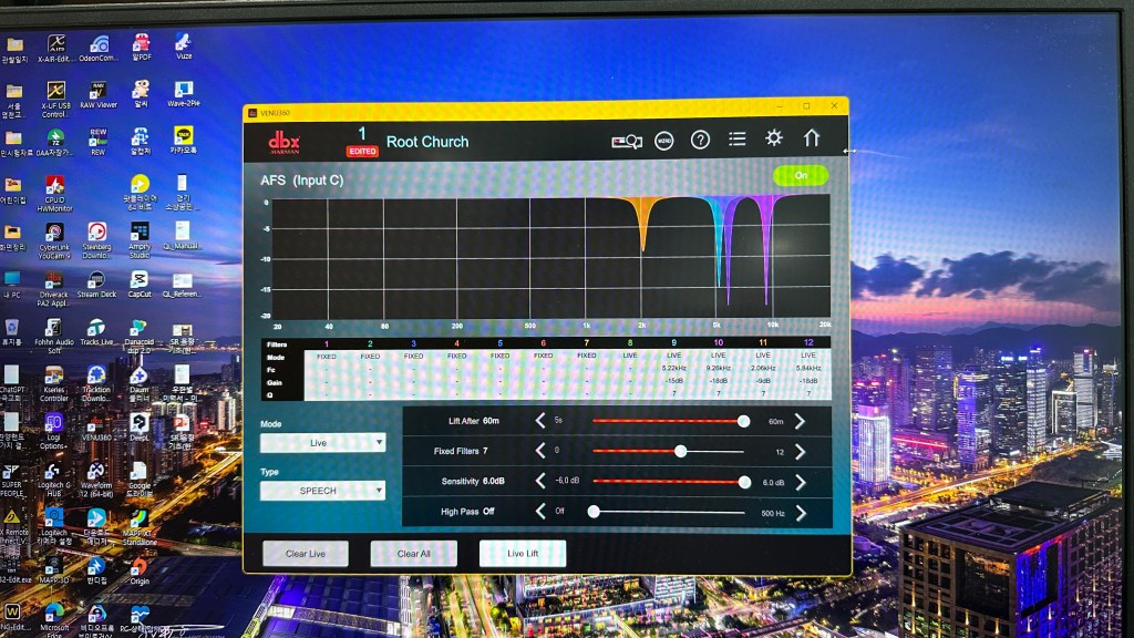 다만 그루터기 교회는 보시듯이 소리 반사가 너무 잘 되는 벽돌조 마감이라 SQ5의 마이크 입력 채널과 메인 출력에서의 측정과 조정에 더해 스피커 프로세서 dbx VENUE 360에서 AFS(Auto Feedback Supressor)를 사용해 하울링(피드백)에 대해 적극적으로 대응을 했습니다.
