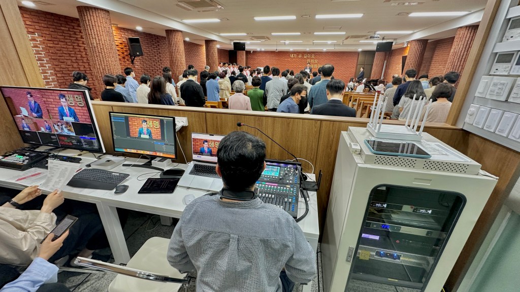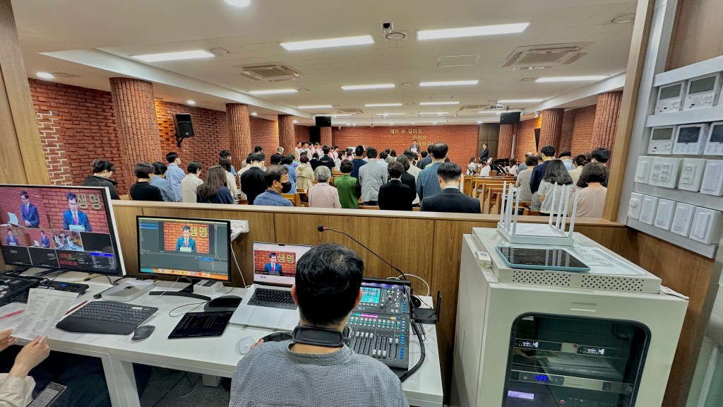 방송 시스템 시공 후 맞는 첫 주 11시 예배가 예배가 교육부 주관이어서 일반 포맷의 예배가 아니라 연출이 필요한 예배였지만, 저희는 토요일 교육 때 미리 그 포맷에 맞는 세팅과 실습을 해 주일날 방송팀이 어려움 없이 예배 방송을 진행하게 되었습니다.