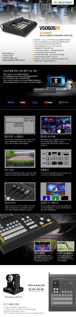 AVMATRIX VS0605U는 비디오 캡처 카드를 내장해 실시간 스트리밍을 지원하며, 크로마키, 루마키를 지원해 간단하게 PPT로 만든 자막을 영상에 오버레이를 간편하게 할 수 있습니다.