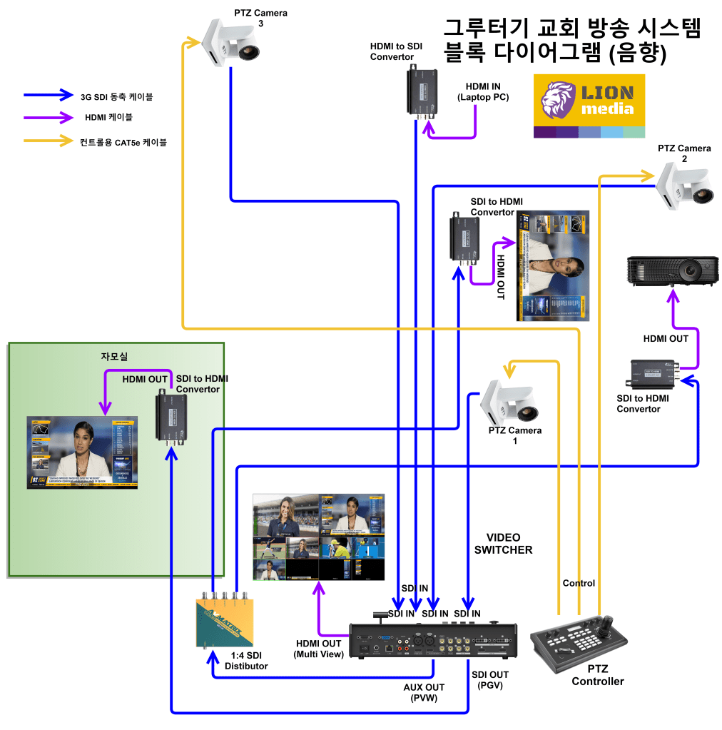영상 장비는 교회 예산에서 가장 고장이 없이 성능이 잘 나오는 소디스텍의 PTZ 카메라와 컨트롤러, 그리고 JVC에서 ODM 으로 선택할 만큼 제품의 성능이 우수한 AVMATRIX의 비디오 스위처 제품으로 선택을 했습니다.
