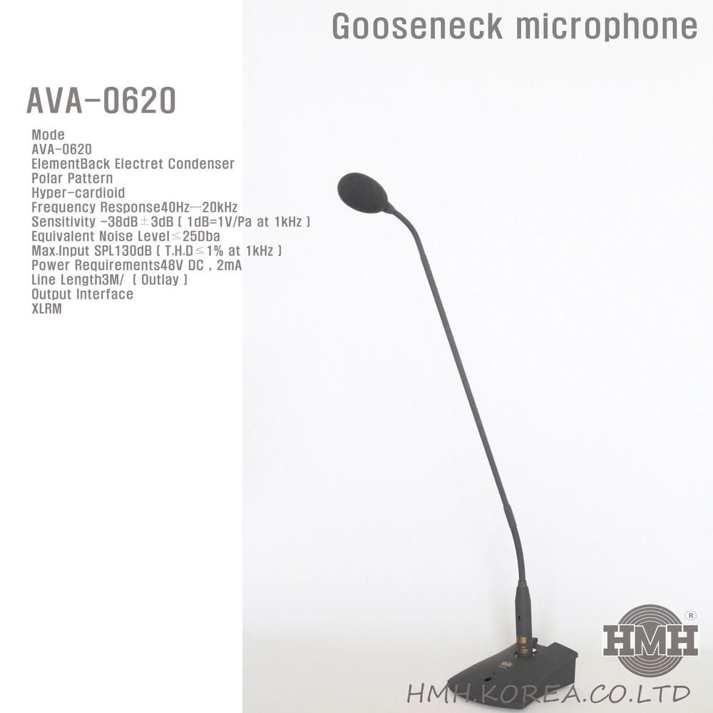 HMH는 국내 음향 제조사인데, AVA-0620 구즈넥 마이크는 세종문화회관에서 이런 마이크 중 가장 비싼 독일 Shoeps사의 마이크와 블라인드 테스트를 여러명의 음악 감독들이 했을 때 아무도 구분을 하지 못했을 정도로 매우 뛰어난 음질과 성능을 가지고 있습니다.