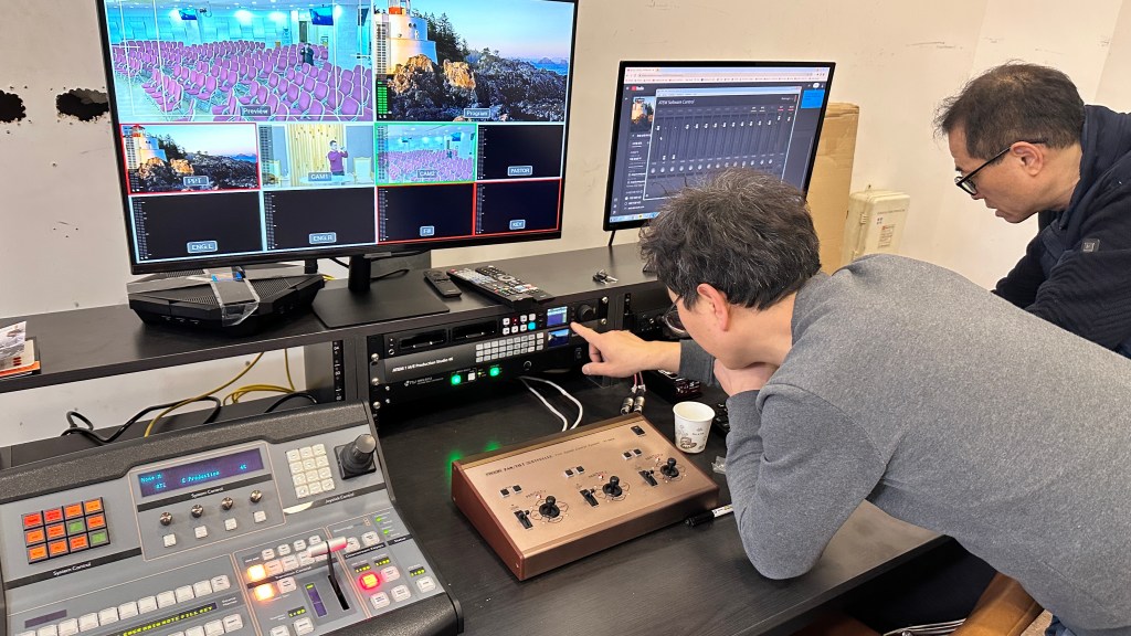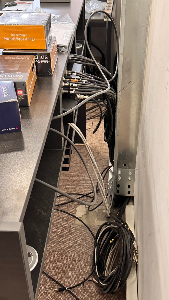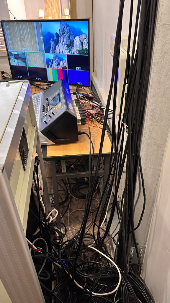 영상 부분은 처음에는 간단히 2군데 위치에 ENG 카메라 연결용 배관배선과 벽부 패널을 설치 요청을 받았지만, 최근 교회에서 직접 구매하신 영상 장비들과 방송실 내 영상 인프라가 맞지 않아 그 부분에 대한 추가 작업을 요청하셔서 싹 다 새로 케이블부터 새 장비 셋업까지 작업을 하였습니다.