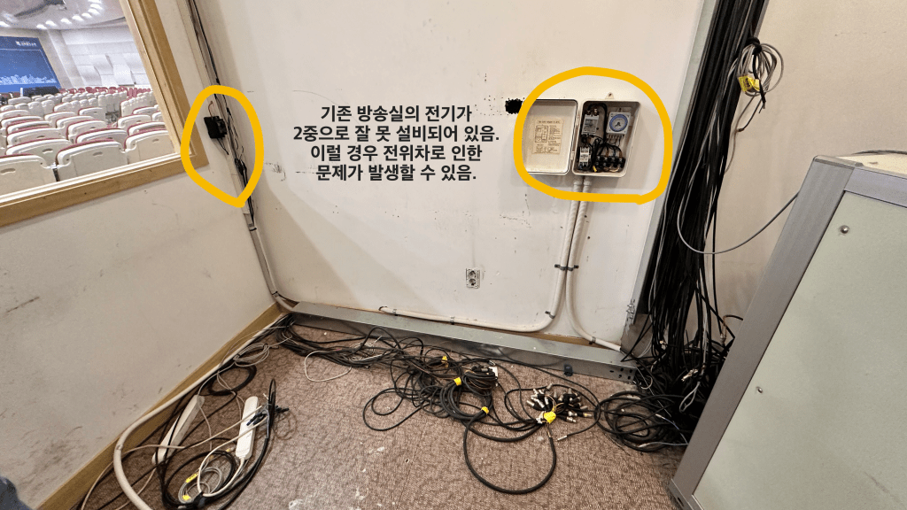 전기는 방송 시스템에서 가장 기초가 되며 매우 중요한 부분인데, 규정 내 전압/충분한 전류량의 누전 차단기와 용량에 맞는 전기 케이블/접지/단일 전기로 설비되지 않으면 방송 시스템에 고장이 나거나 잡음 문제가 생깁니다.