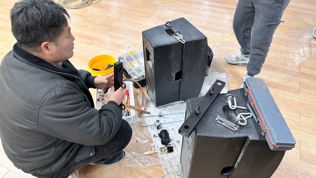 차후에 다시 EAW 스피커를 달 수 있도록 해 달라는 요청에 따라 천정에 설치된 리깅 체인은 그대로 사용하고, CHR15 용 리깅 바를 직접 제작해 설치를 했습니다.