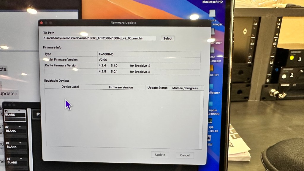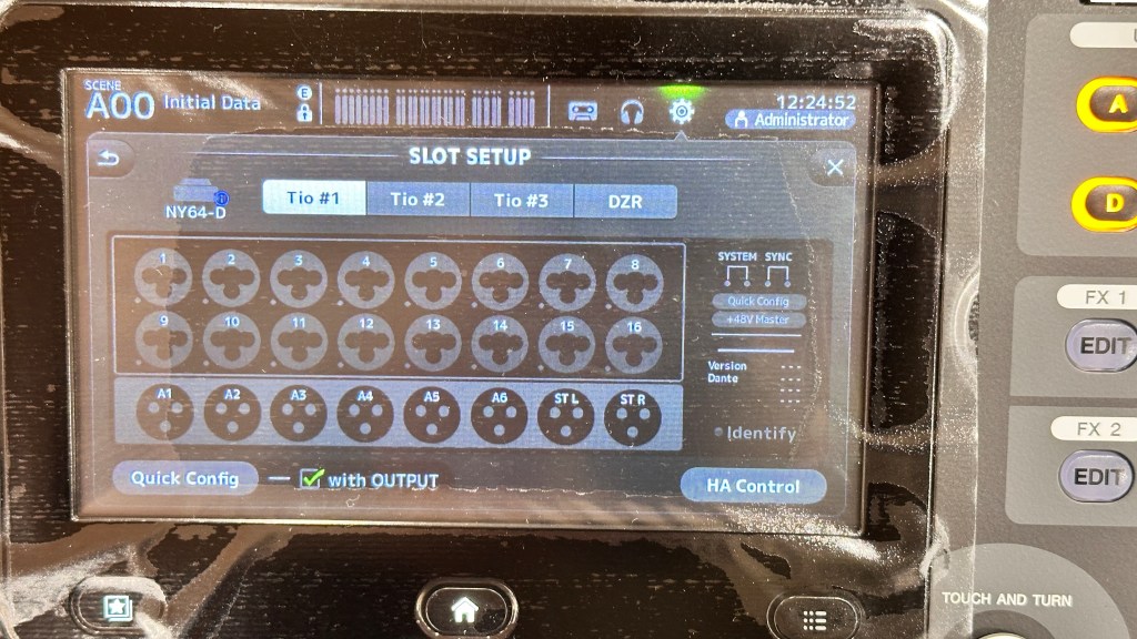 TF5와 Tio-1608 D2의 연결 통신 방식은 Dante로 연결하는데 TF5에 Dante 카드를 설치하고 Tio-1608 D2와 미리 연결해 테스트를 해서 문제가 없는지 체크를 합니다.