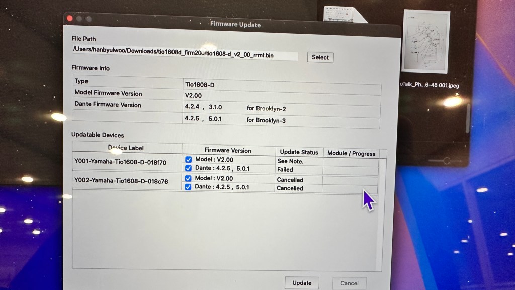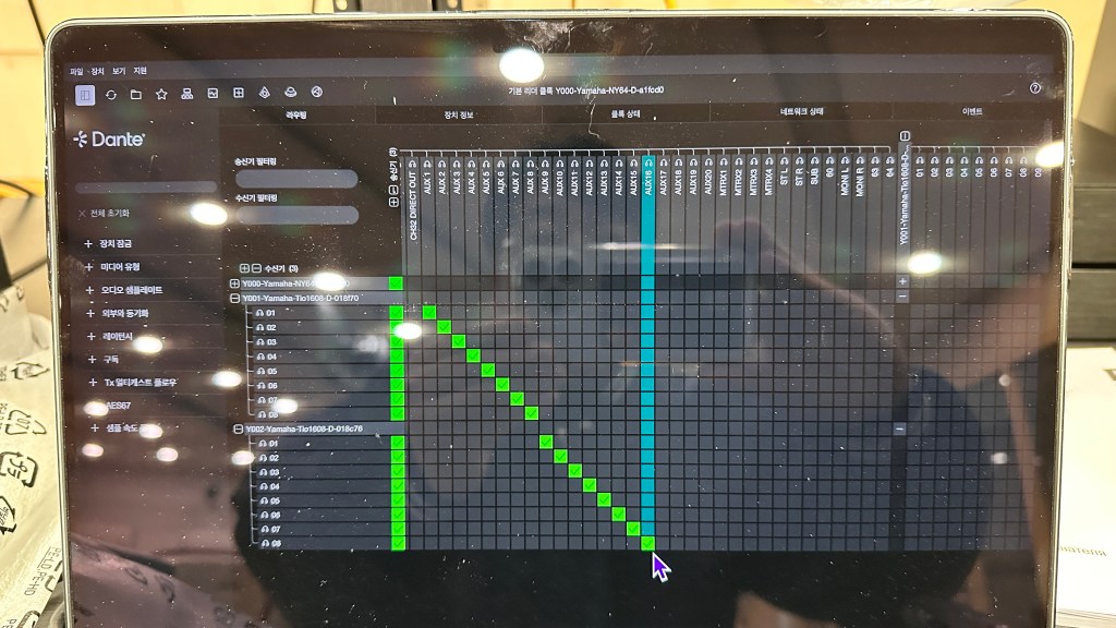 YAMAHA MUSIC KOREA의 지원으로 장치를 포맷을 하고 5단계에 이르는 작업을 다시 진행해 연결 설정이 제대로 되는 것을 확인을 했습니다.(TF의 Dante 하드웨어 세팅과 소프트웨어 세팅이 매우 복잡하게 되어 있어 저와 친한 국내 최고의 실력을 가진 음향 교수도 세팅을 잡는데 하루 종일 걸렸다고 했습니다. 야마하 담당자 조차 두 번의 시도에 실패하고 새로 올 리셋을 하고 5단계를 천천히 같이 세팅해 완료할 만큼 까다로운 작업이었습니다. 아마 Dante 세팅 디지털 믹서 중 가장 어려운 기기들이 아닐까 생각됩니다.)