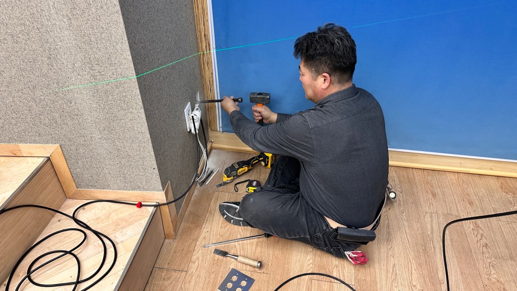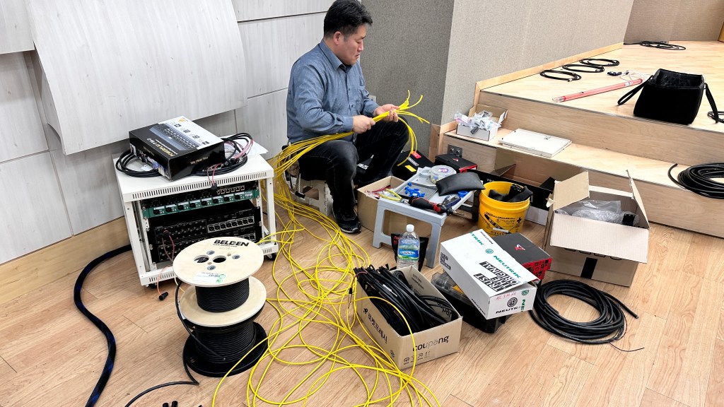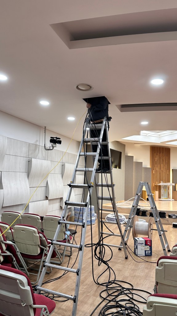 방송실 내 음향 영상 배관 배선 작업을 동시에 해야 하다 보니 난이도가 많이 올랐으나 마지막 날까지 밤늦게 작업을 완료해 주일 예배를 잘 드릴 수 있도록 만들어 드렸습니다.