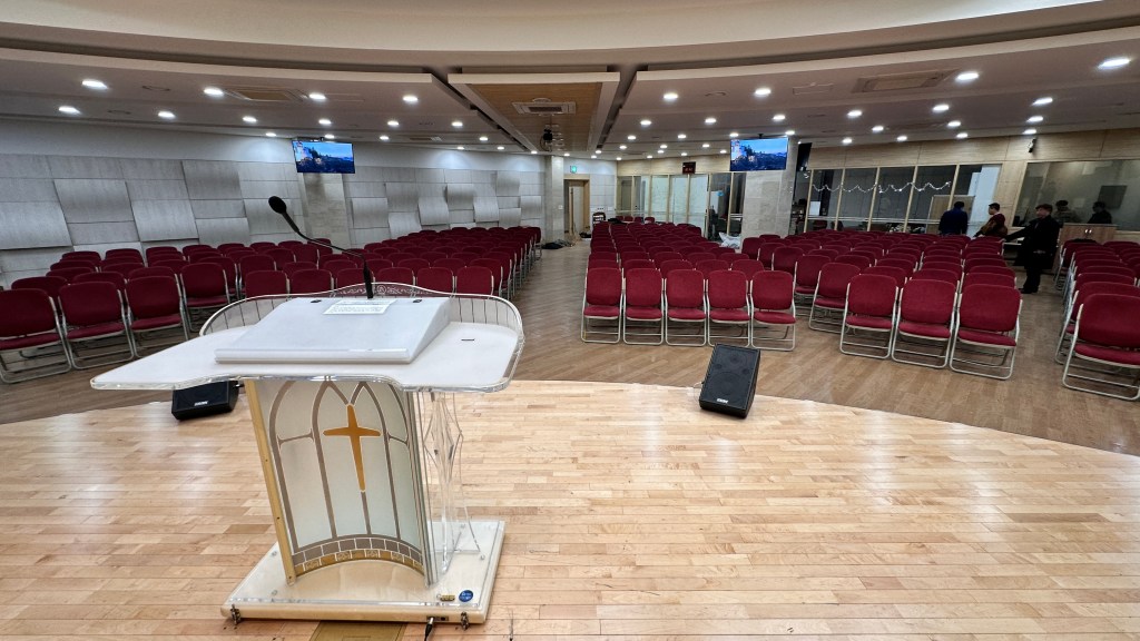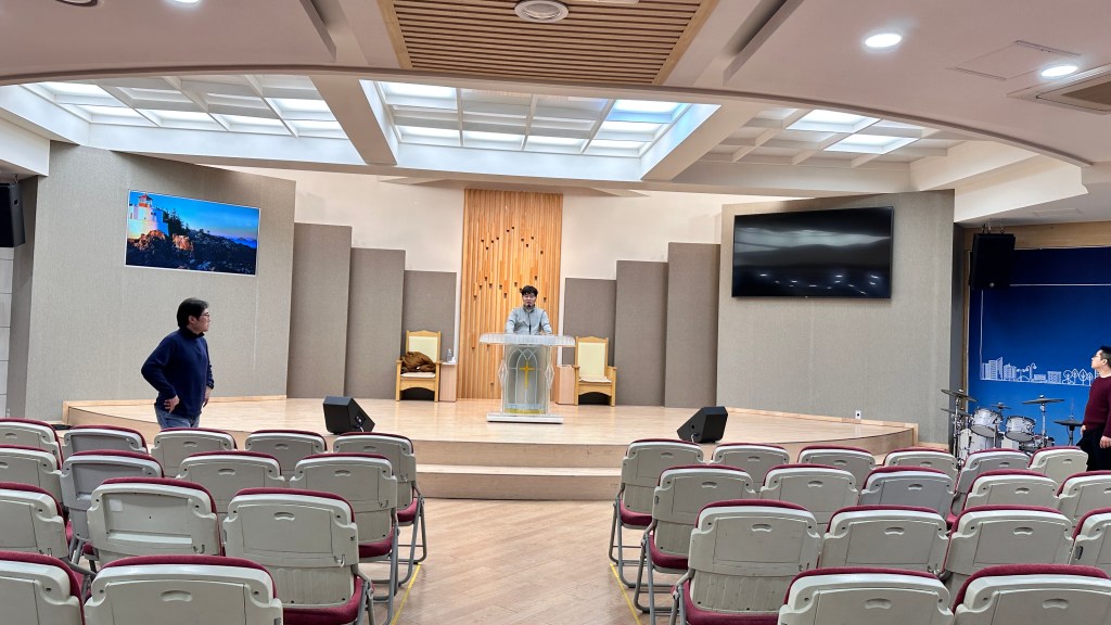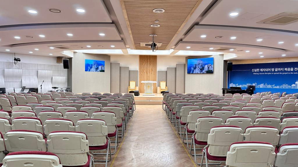 강단 바로 아래 찬양 팀이 위치하는데, 기존에는 뒤에서 봤을 때 좌측에 위치해 설교자의 동선에 중복이 되어 좋지 못했습니다.