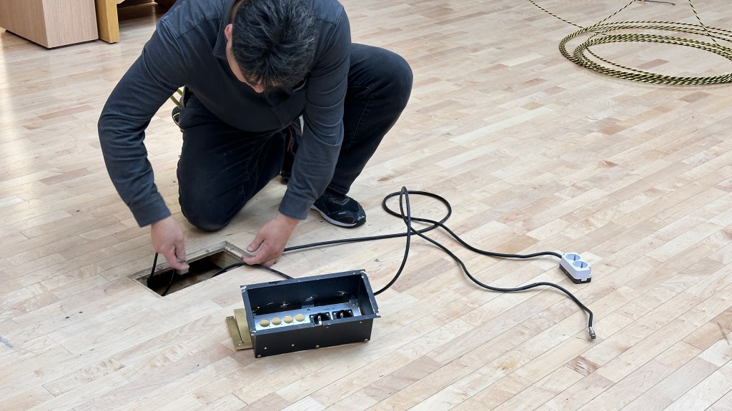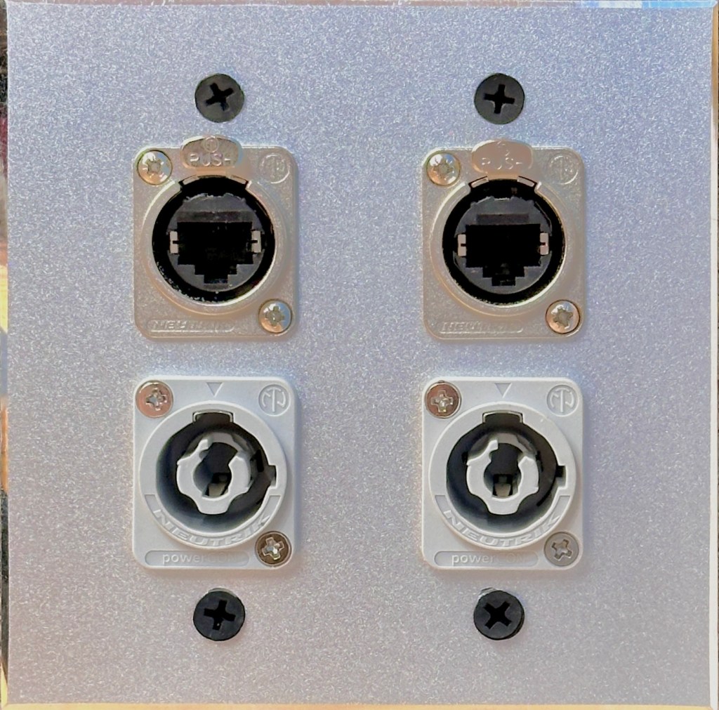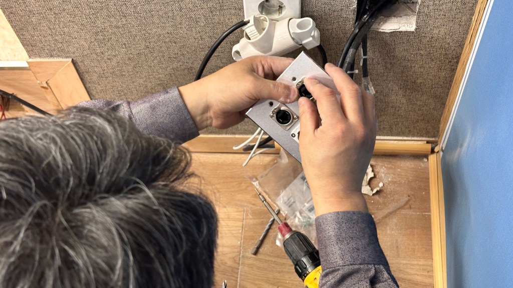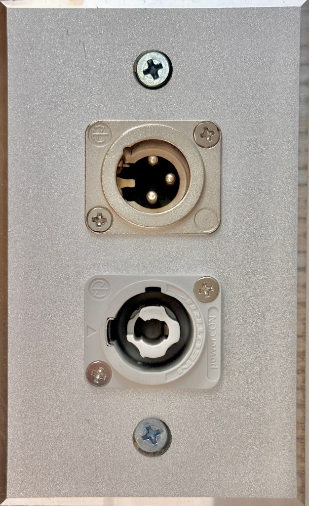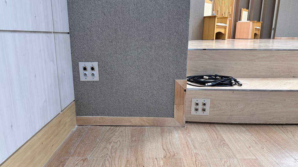 그 외에 강단 위에 컬럼 어레이 스피커를 설치할 경우가 있어 벽에 컬럼 어레이 스피커 연결을 위한 오디오 단자와 전원 연결용 파워콘을 만들어 드렸습니다.