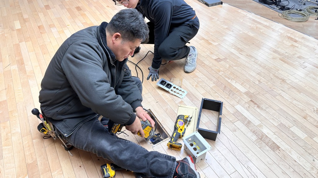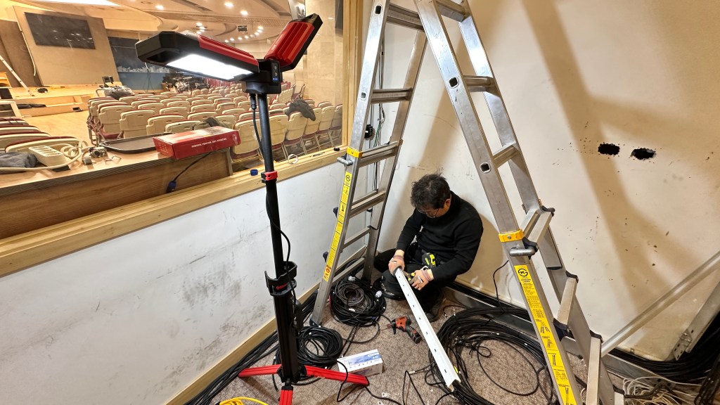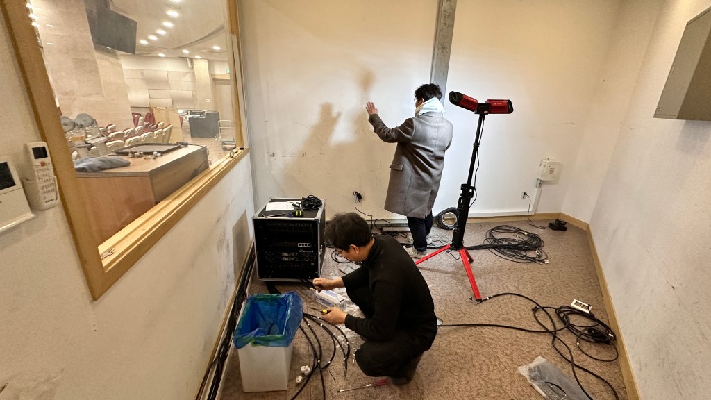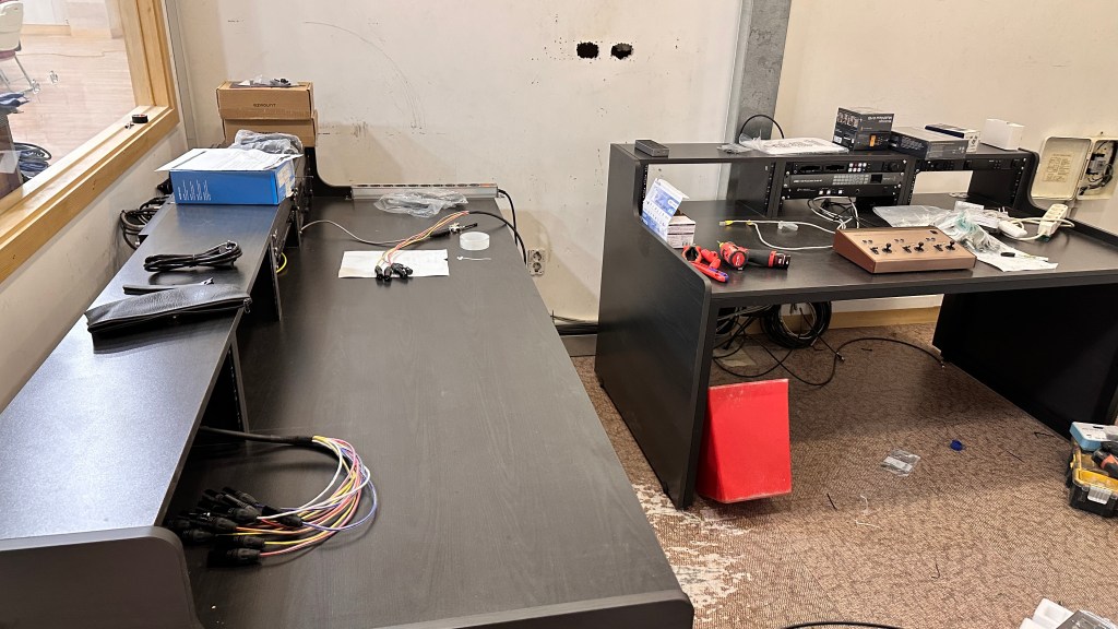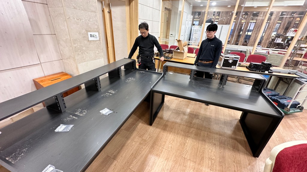 방송실은 기존 시공 업체가 케이블링을 엉망으로 해 놓아 방송실 전체를 다시 정리하기로 하고, 방송용 데스크를 도입하며 음향 및 영상 라인, 방송실 전원 라인 체계를 새롭게 정리정돈을 준비했습니다.