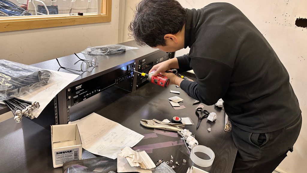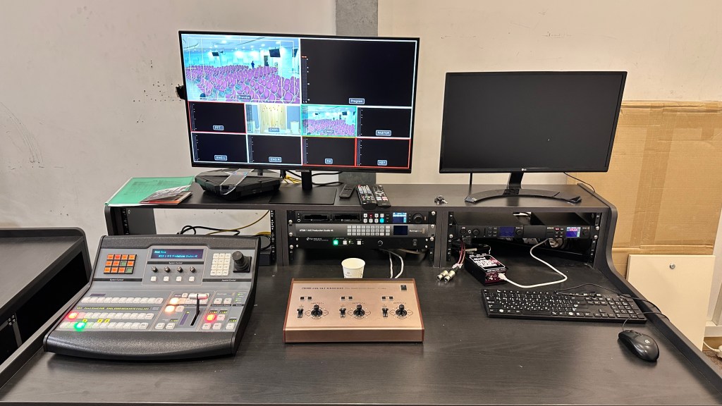 데스크 위에 랙이 있어 무선 마이크 수신기, 프로세서, 랙 타입의 비디오 장치 등을 깔끔하게 설치해 눈으로 바로 확인하고 작업하기에 좋습니다.