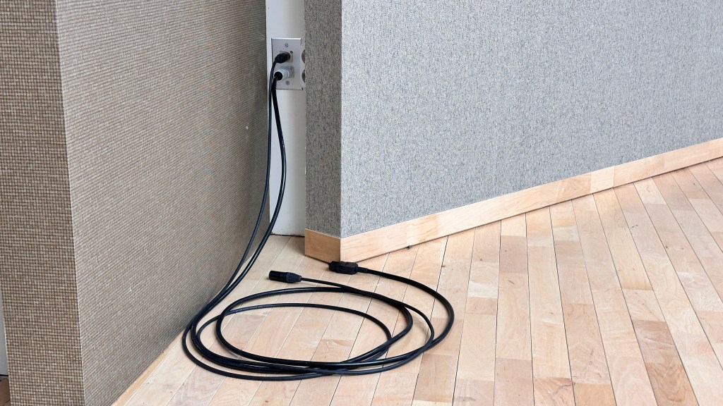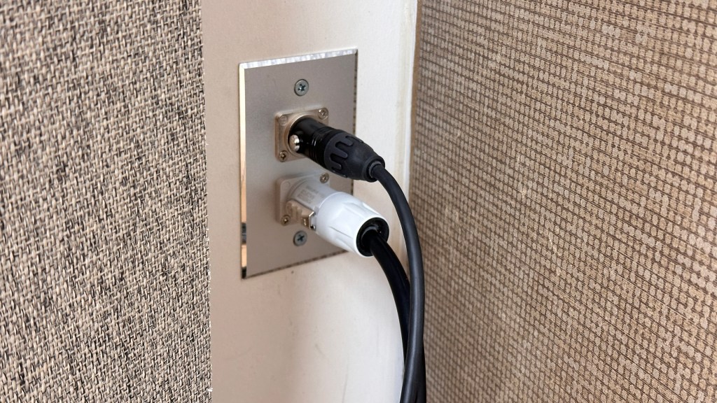 강단의 음향 전기는 모두 파워콘 규격으로 만들었는데, 이는 일반 콘센트를 할 경우 선풍기나 전열기 등 다른 가전 기기를 연결하여 전기 노이즈가 음향 시스템에 들어오기 때문에 이를 방지하고자 전원 연결 단자를 파워콘으로 만들었습니다.