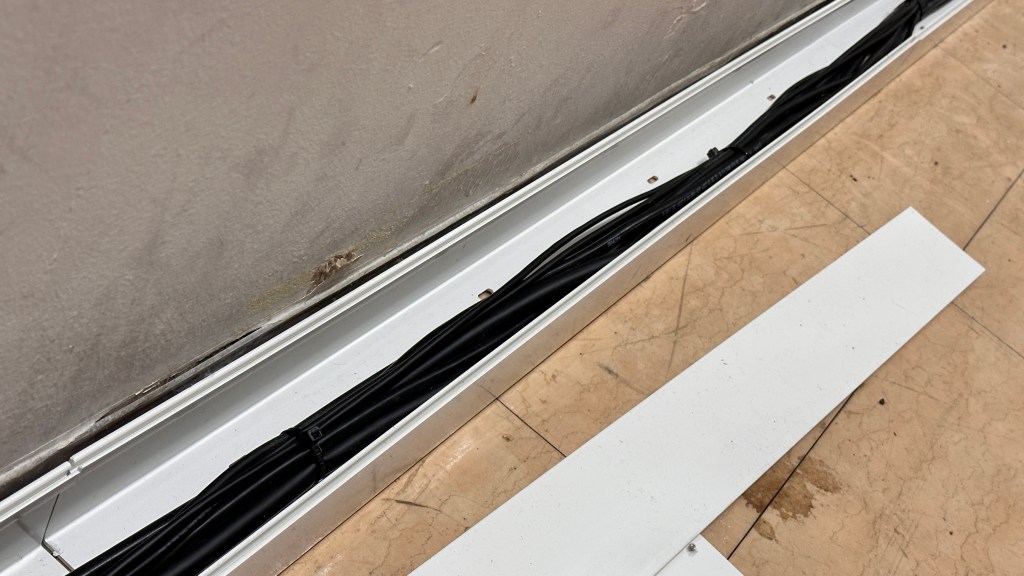 기존 케이블과 커넥터 박스 고장이 많아 케이블도 교체를 해야 했었는데, 예산이 충분하다면 케이블 시공도 천정으로 보내어 깔끔하게 하고 싶었으나, 높은 층고와 복잡한 구조 때문에 시공 기간과 비용을 많이 들어 차선책으로 기존의 방법대로 오른쪽 벽체 아래쪽으로 덕트를 만들어 보내는 것으로 하였습니다. (기존은 덕트로 마감이 안 되어 케이블들이 보기 지저분하게 되어 있었습니다.)