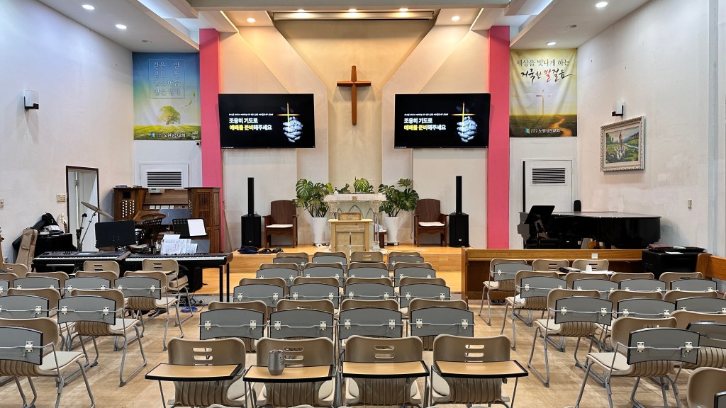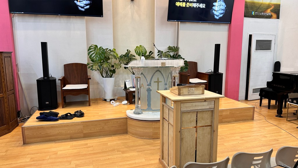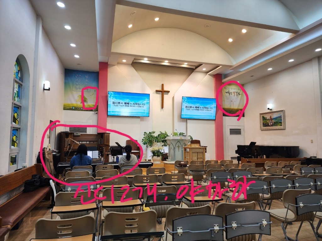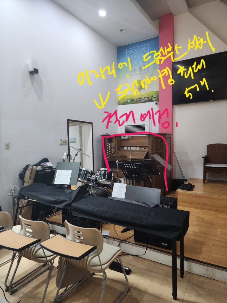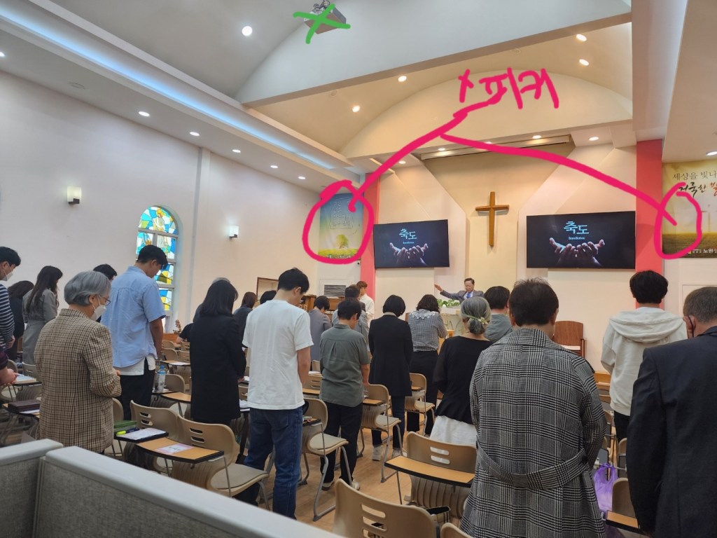 노원성진 교회는 이에 더해 기존 스피커가 높이 설치되어 있었고(양쪽 플래카드 뒷쪽), 그래서 스피커의 소리는 머리 위로 날아가 버리고 있었고, 그 소리 마저 고음을 담당하는 트위터가 고장나 심하게 명료도가 떨어져 있었습니다.