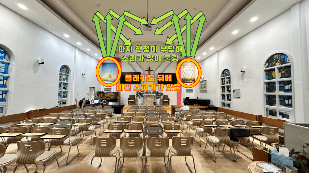 높은 층고와 아치 구조에 스피커의 소리가 많이 반사되어 잔향(울림)이 많이 생겨 설교자와 찬양 소리의 명료도가 떨어지고 해상도 또한 낮아집니다.