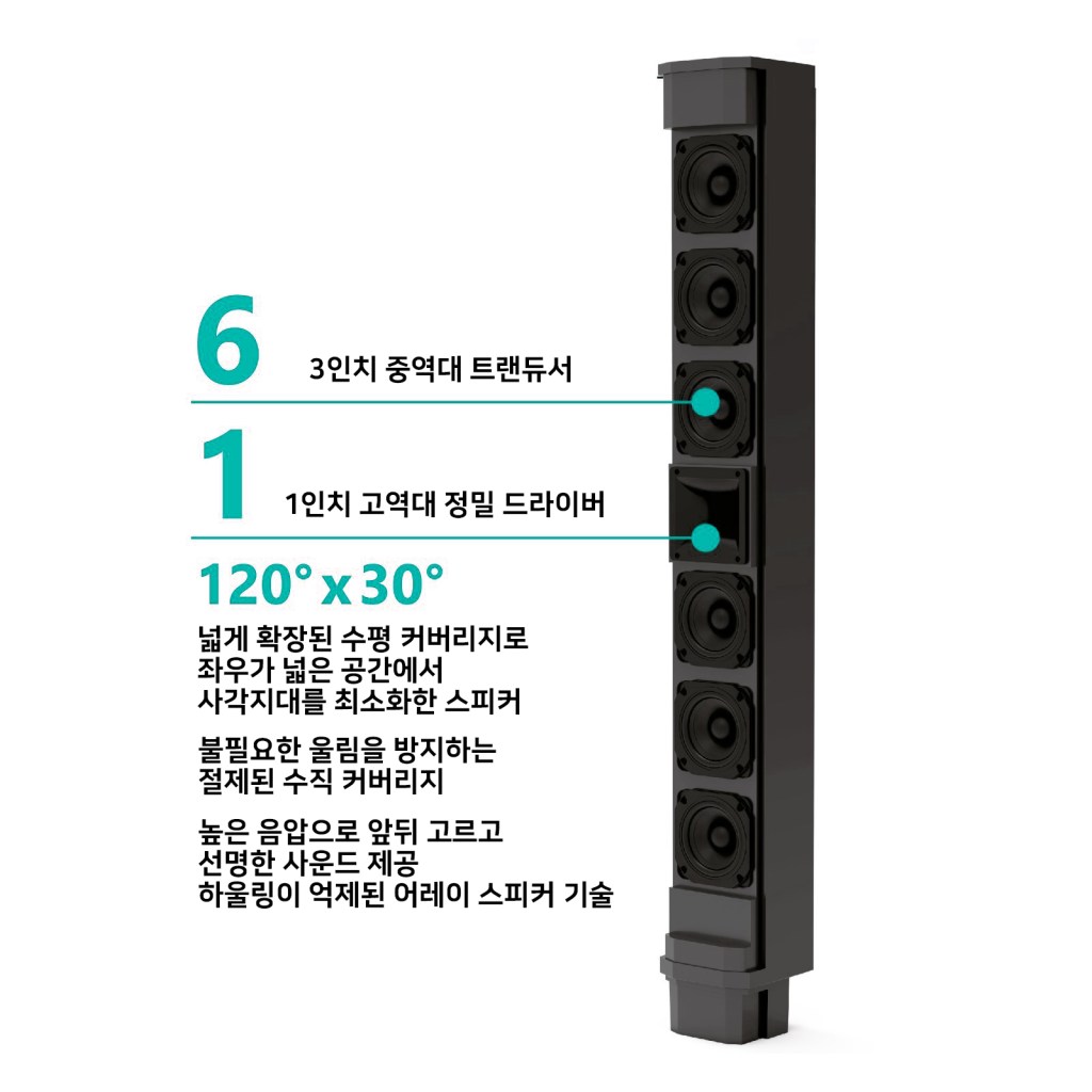 위의 문제를 해결하기 위해서는 스피커는 낮춰 설치해야 하고, 위쪽으로 가는 사운드가 적어 반사음을 근본부터 적게 만드는 컬럼 어레이 스피커가 최적이었습니다.
